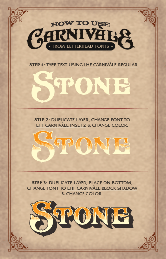 From the mind of Patrick Kalange comes this highly-imaginative font set reminiscent of old cigar labels and classic glass signage from the late 1800's. LHF Carnivàle is truly a one of a kind creation with its unique mix of Gothic and serif styles. Includes 4 fonts: Regular, Inset 1, Inset 2 & Block Shadow to make it easy to create professional designs quickly. LHF Carnivàle should be in every designer's tool kit.