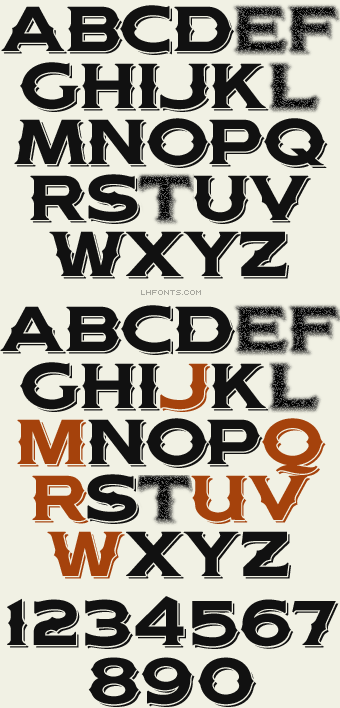 Set includes 6 fonts: Regular, Spurs, Regular Shadow 1 & 2 and Spurs Shadow 1 & 2. See the lower left for shadow details.